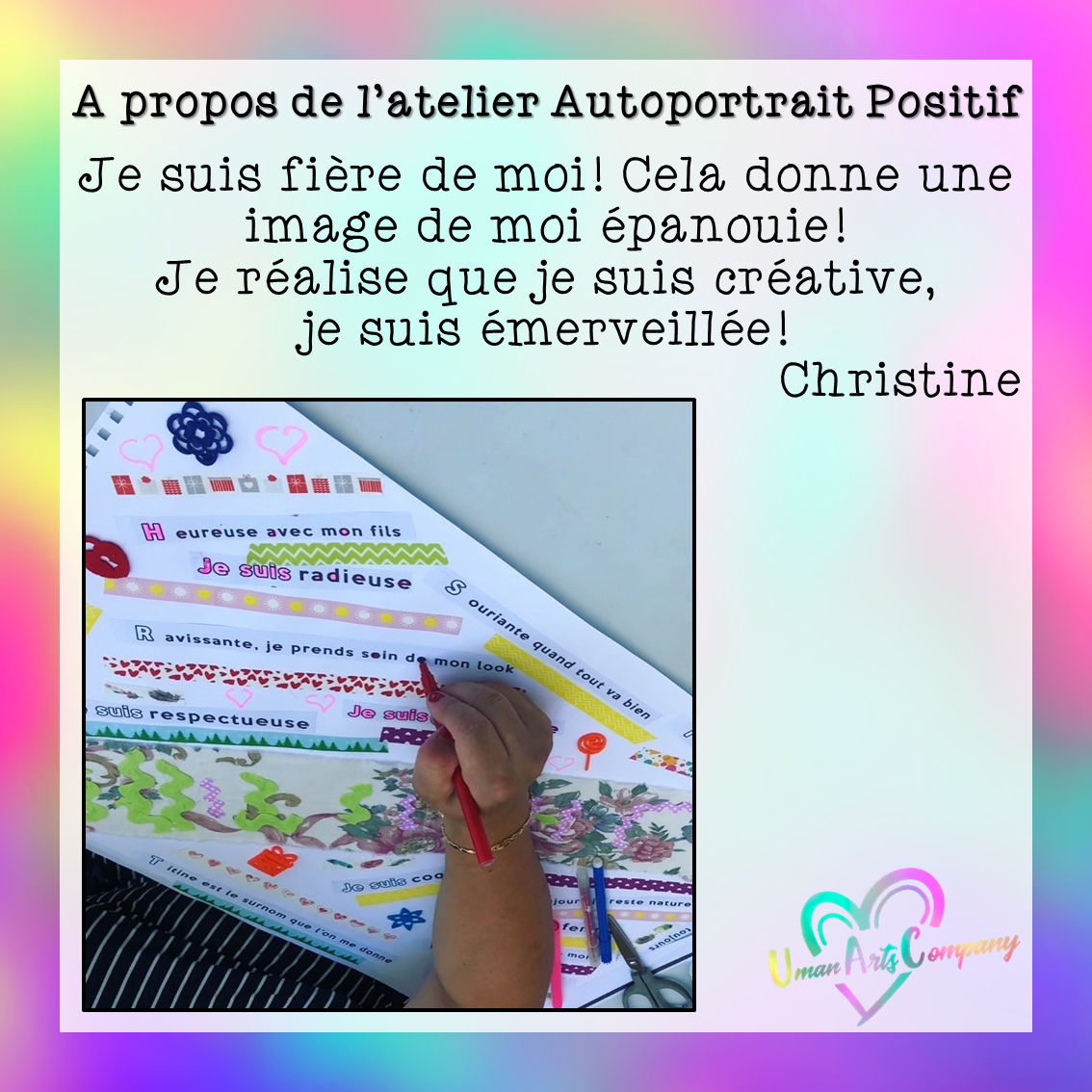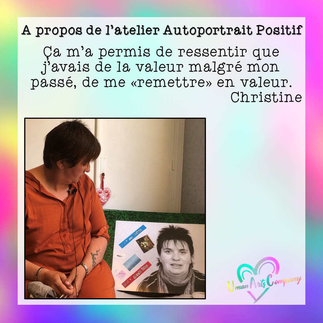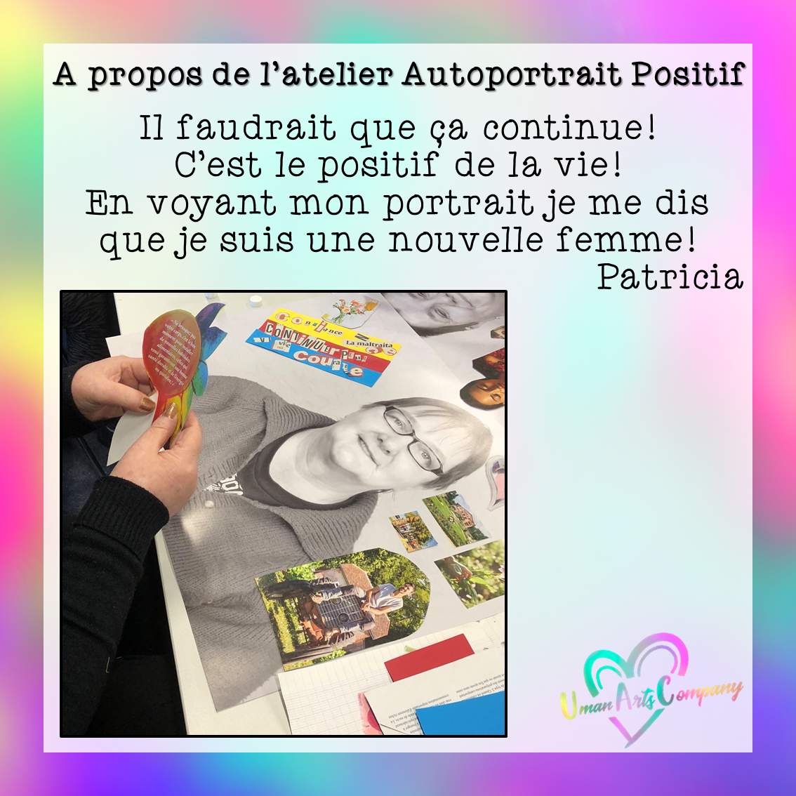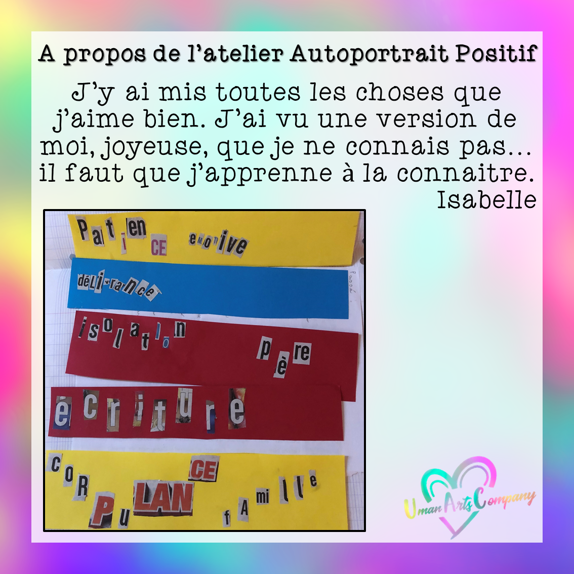 Les ateliers « Autoportrait positif » étaient animés par Anne Lucie Viscardi, Art-thérapeute, investie au sein de Uman Arts Company