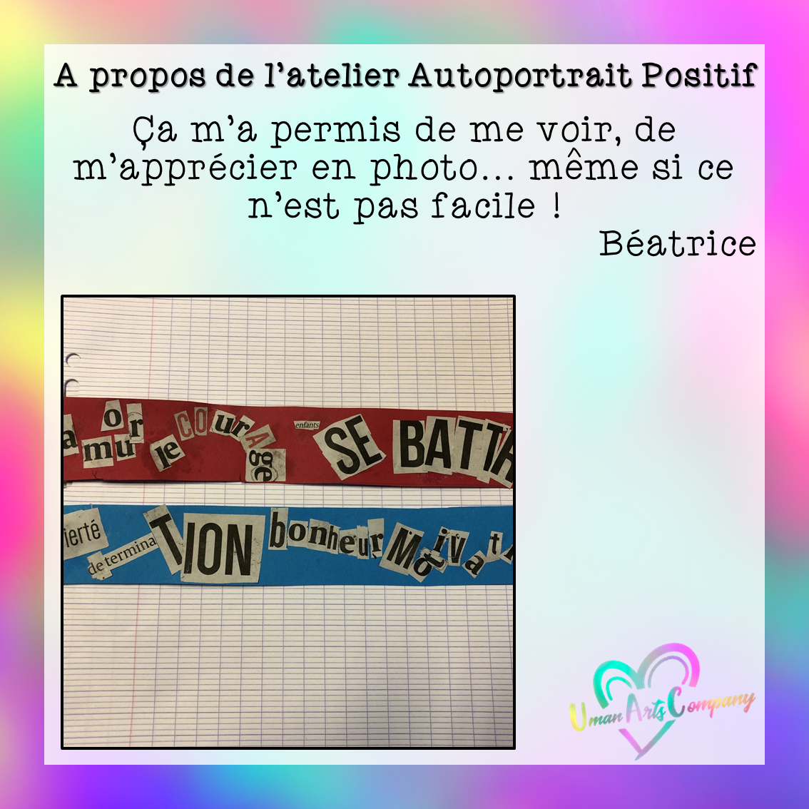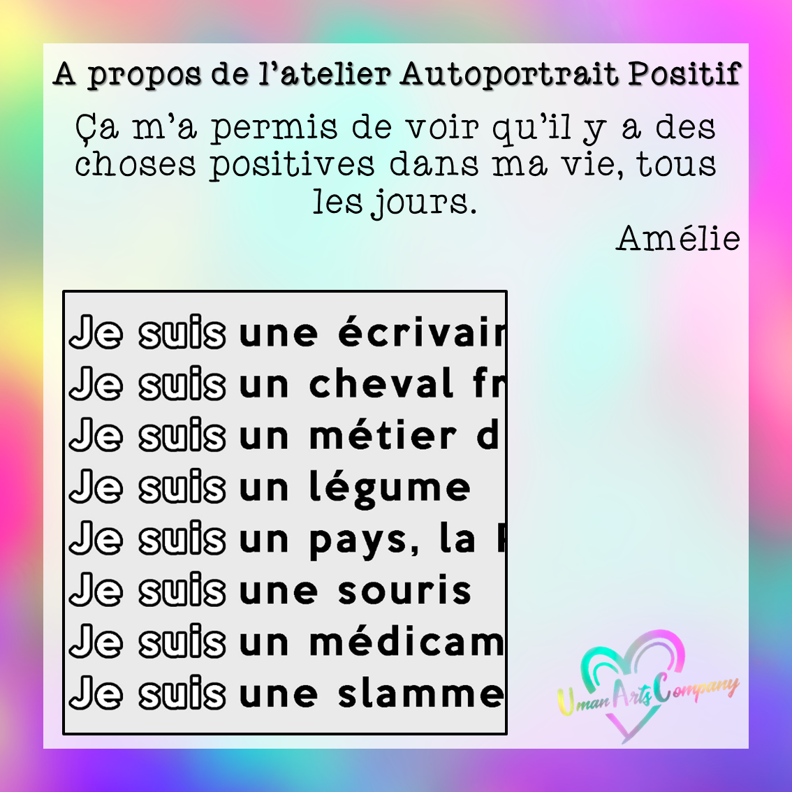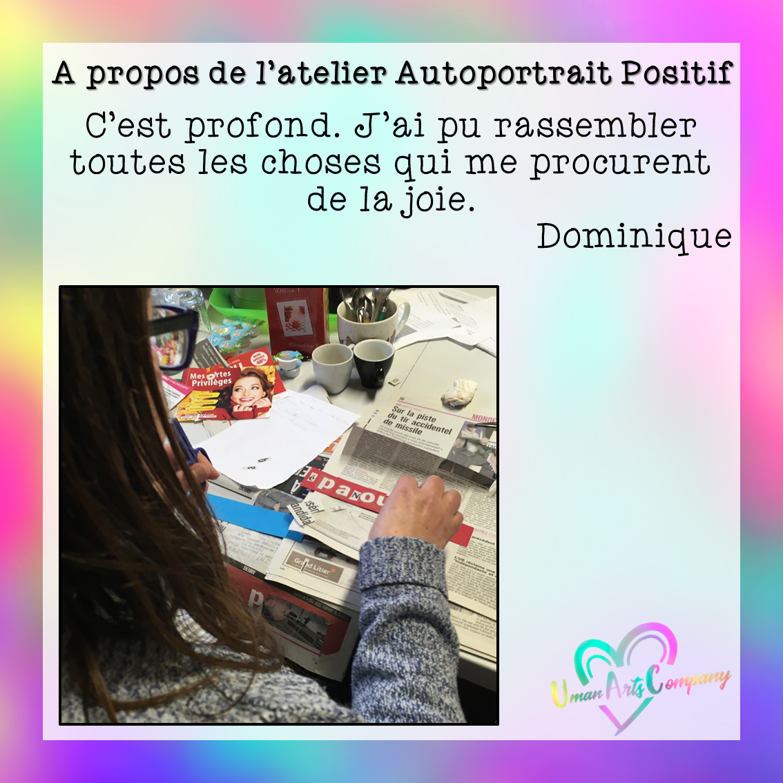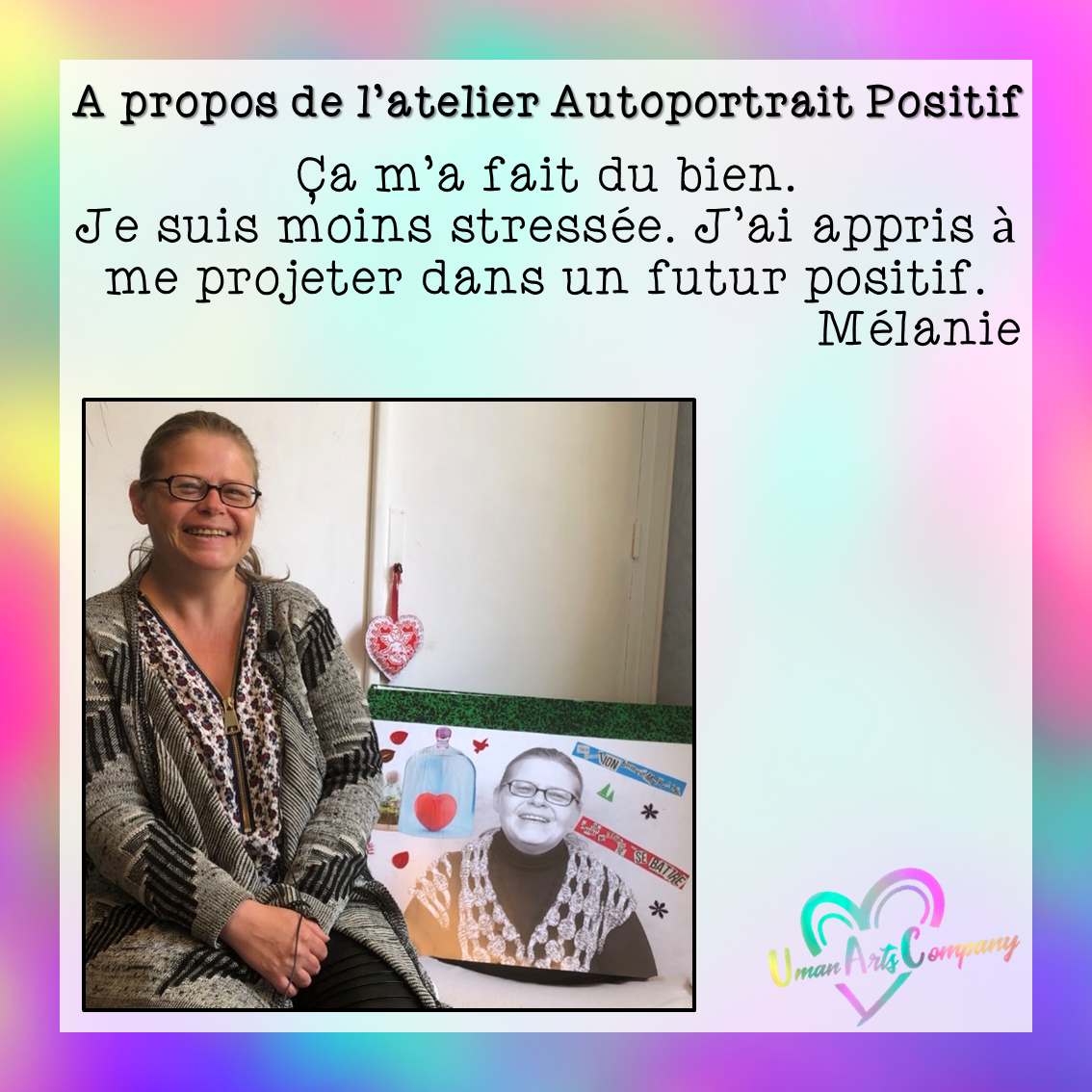 Les ateliers « Autoportrait positif » étaient animés par Anne Lucie Viscardi, Art-thérapeute, investie au sein de Uman Arts Company